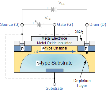 对于n沟道耗尽型MOS晶体管,负栅源电压-VGS将耗尽其导电沟道的自由电子(因此得名),从而使晶体管“关断”。